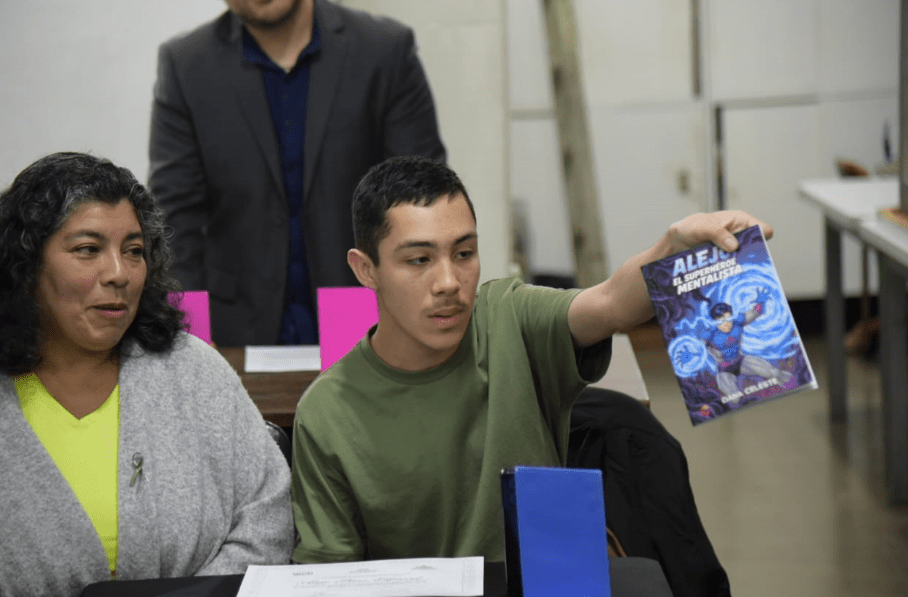 Su obra, “Alejo, el superhéroe mentalista”, creada junto a la profesora Dana Celeste, narra la historia de un joven que, a pesar del bullying y la discriminación, logra salir adelante, cumpliendo sueños y ayudando a otros. En un gesto conmovedor, el autor incluyó como superhéroes en su historia a compañeros que comparten sus mismas condiciones.