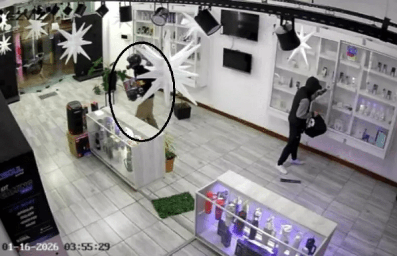 La secuencia del ilícito quedó registrada mediante una cámara de seguridad interna. En las imágenes se aprecia que uno de los autores cubría su rostro con un casco, el otro lo hacía parcialmente con la capucha de un buzo.