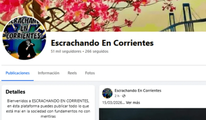 La página de Facebook “Escrachando en Corrientes” cuenta con 51 mil seguidores y continúa en crecimiento. En ese espacio se difunden denuncias públicas contra personas y situaciones que los usuarios consideran reprochables. Las publicaciones aparecen en distintos formatos y carecen de sustento legal o verificación previa.