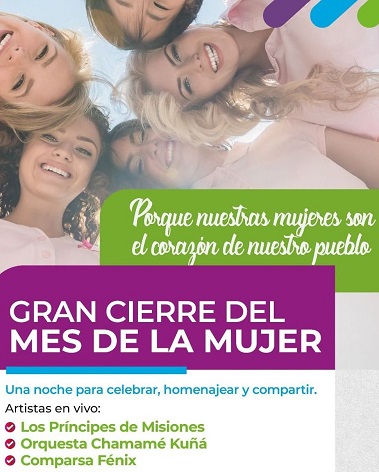El evento contar con la participacin de artistas en vivo como Los Prncipes de Misiones, la Orquesta Chamam Ku que brindar un homenaje especial a las mujeres y la Comparsa Fnix, adems de sorteos especiales destinados a las mujeres de la localidad y sus parajes.
